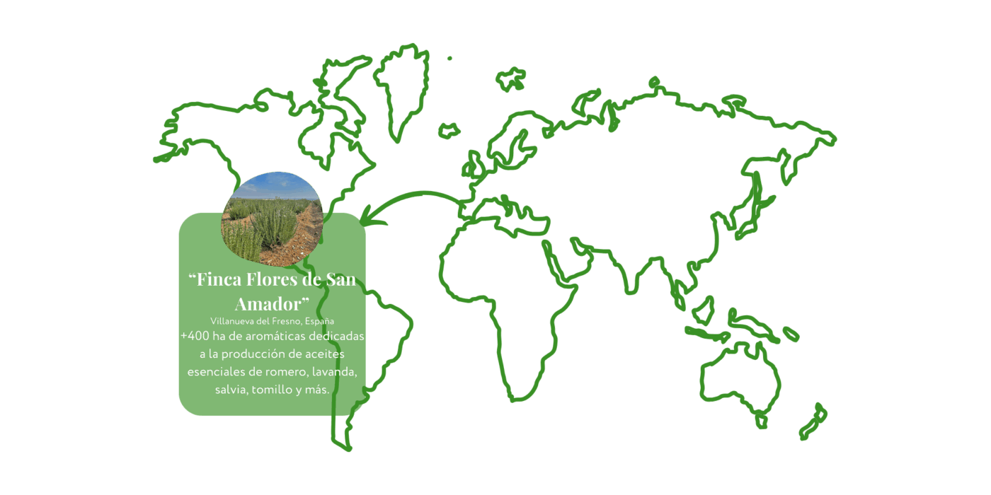 La finca está ubicada en el pintoresco pueblo de Villanueva del Fresno, en Badajoz (España). Se trata de un proyecto reciente que abarca una superficie de más de 400 hectáreas de cultivo de aromáticas en secano y en regadío.
